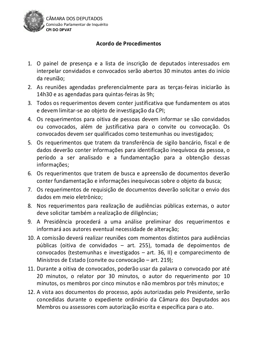 O documento aborda ainda a questão da busca e apreensão de documentos, bem como das audiências públicas externas e realização de diligências. Estabelece também, entre outras coisas, que a comissão deverá realizar reuniões com momentos distintos para audiências públicas (oitiva de convidados), tomada de depoimentos de convocados (testemunhas e investigados) e comparecimento de ministros de Estado (convite ou convocação).