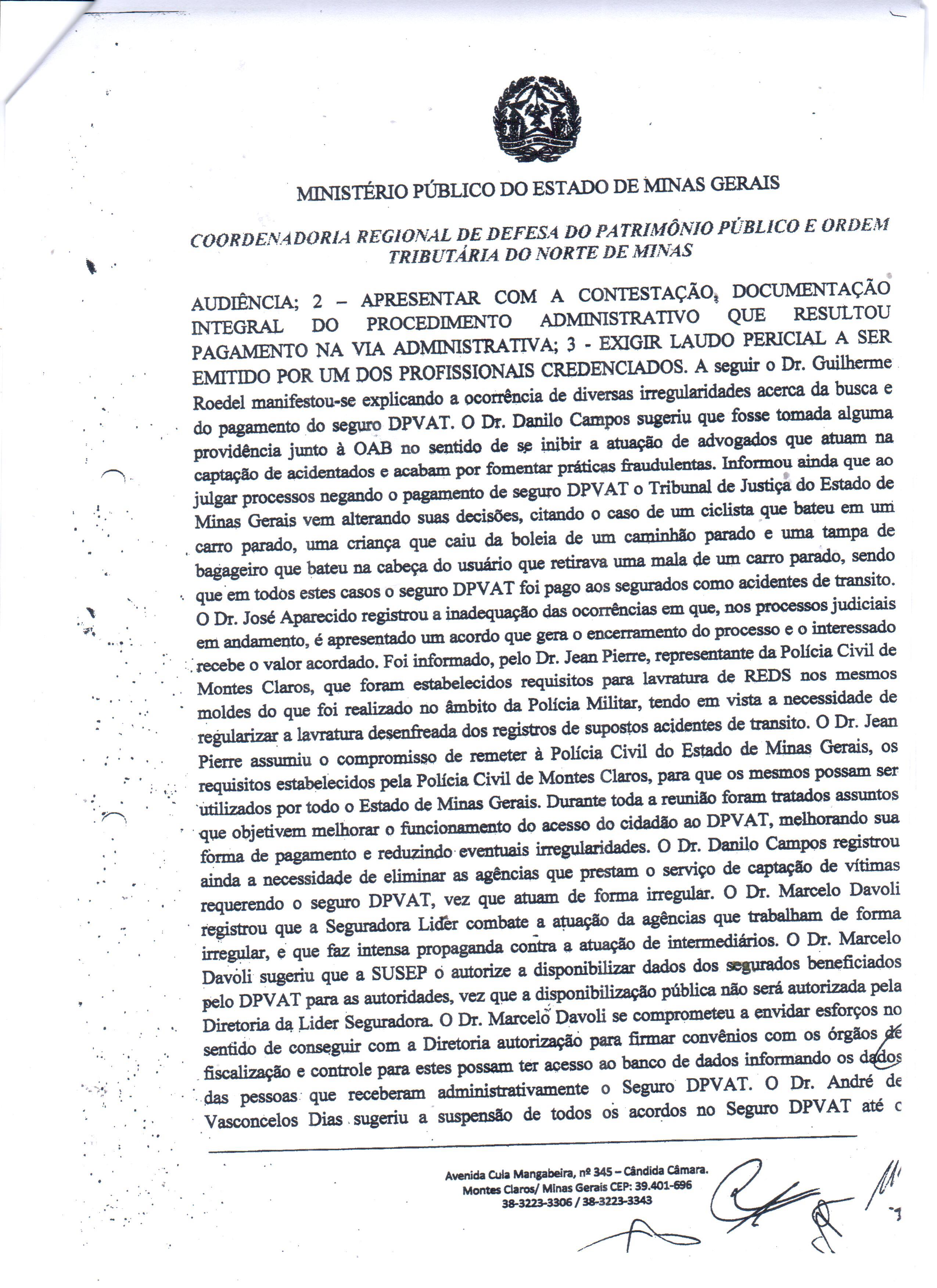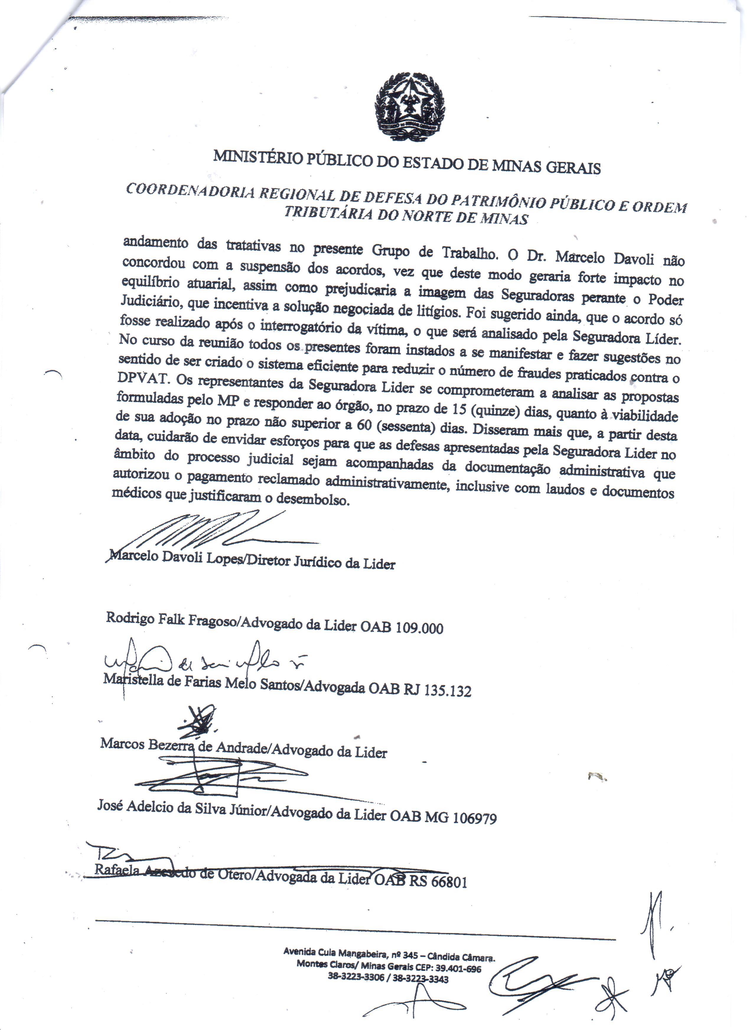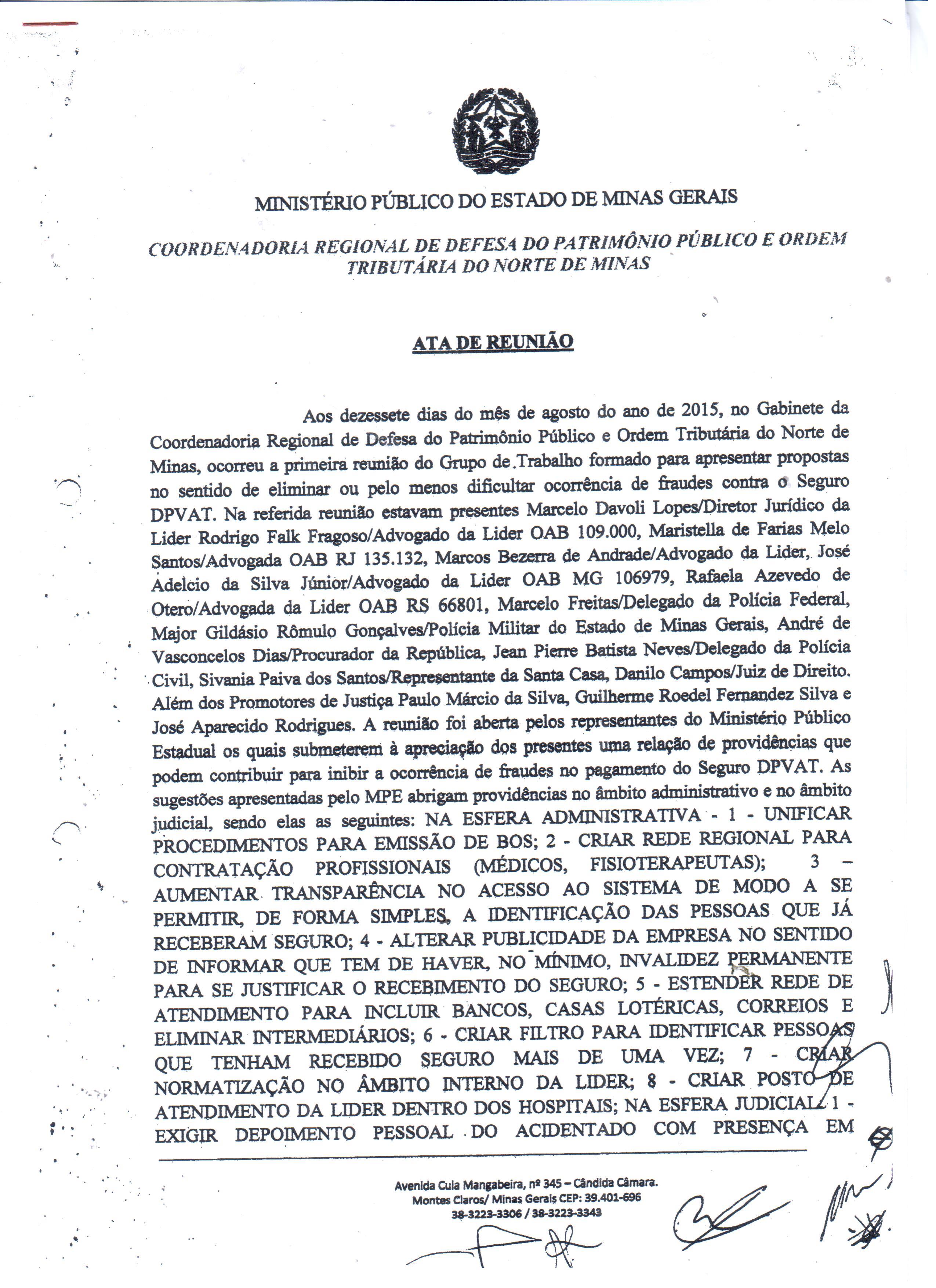 Conforme documentos em agosto do ano passado, o Ministério Público (MP) de Minas Gerais formulou uma série de contribuições para inibir as fraudes praticadas contra o DPVAT, em reunião de um grupo de trabalho (GT) instituído para apresentar propostas no sentido justamente de conter as irregularidades no pagamento de indenizações. A grande maioria das sugestões foram direcionadas para Seguradora Líder.